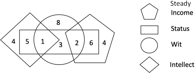 The answer is B. The overlap between the circle and the rectangle has a total of 6 people within it. There are 4 people in the section of the pentagon which does not overlap with any of the other shapes. Therefore, there are two more people who have both wit and status among other traits than those who just have a steady income.